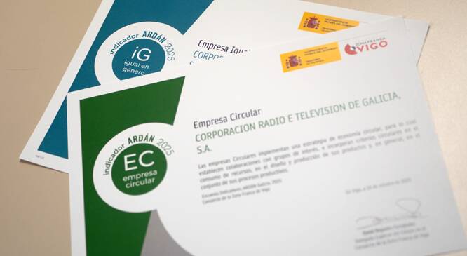 Santiago, 13.11.2025.- A Corporación de Servizos Audiovisuais de Galicia recibiu a acreditación que a recoñece por sétimo ano consecutivo como Empresa Igual en Xénero, e repite, por segunda vez, o indicador de Empresa Circular. Estes Indicadores ARDÁN son outorgados polo servizo de información empresarial desenvolvido polo Consorcio da Zona Franca de Vigo, que se publica anualmente.